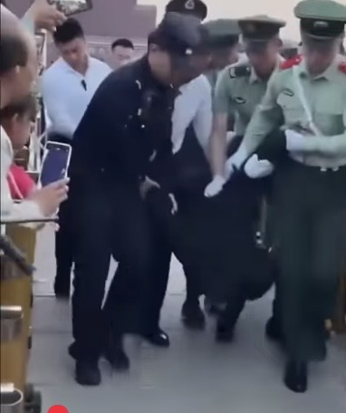 (菱傳媒/綜合報導)中國六四事件36週年前夕,根據網上流傳的影片,前(2日)北京天安門廣場清晨升旗典禮要結束的時候,一名男子從觀眾區突然翻越隔離柵欄直衝升旗台。隨後遭到多名維安人員撲倒並帶走。
