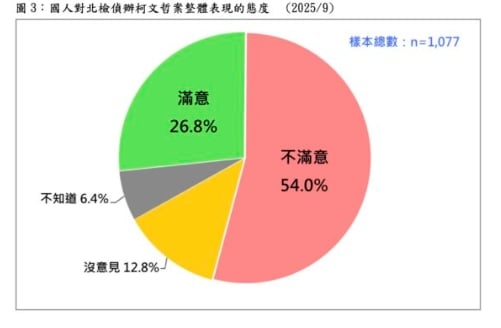 民調也訽問,「一般說來,您對台北地檢署偵辦柯文哲案的整體表現,滿不滿意?」結果顯示,5.4%非常滿意,21.4%還算滿意,28.8%不太滿意,25.2%一點也不滿意,12.8%沒意見,6.4%不知道、拒答。亦即五成四不滿意台北地檢署偵辦柯文哲案的整體表現,二成七滿意。
