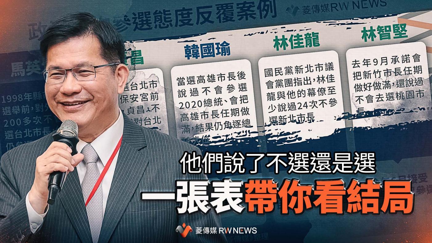 (記者景義豫/綜合報導)民進黨選對會10日通過徵召無任所大使林佳龍代表綠營參選新北市長,11日林佳龍遭國民黨新北市議會黨團揭露,林和他的幕僚過去至少24次對外表示不會參選新北市長,但最後關頭林佳龍還是轉變態度點頭表明願意參選新北市。《菱傳媒》為讀者整理歷年來說過不參選,最後又在選前髮夾彎決定參選的參選人,看看這些人成功當選的指數有多高。