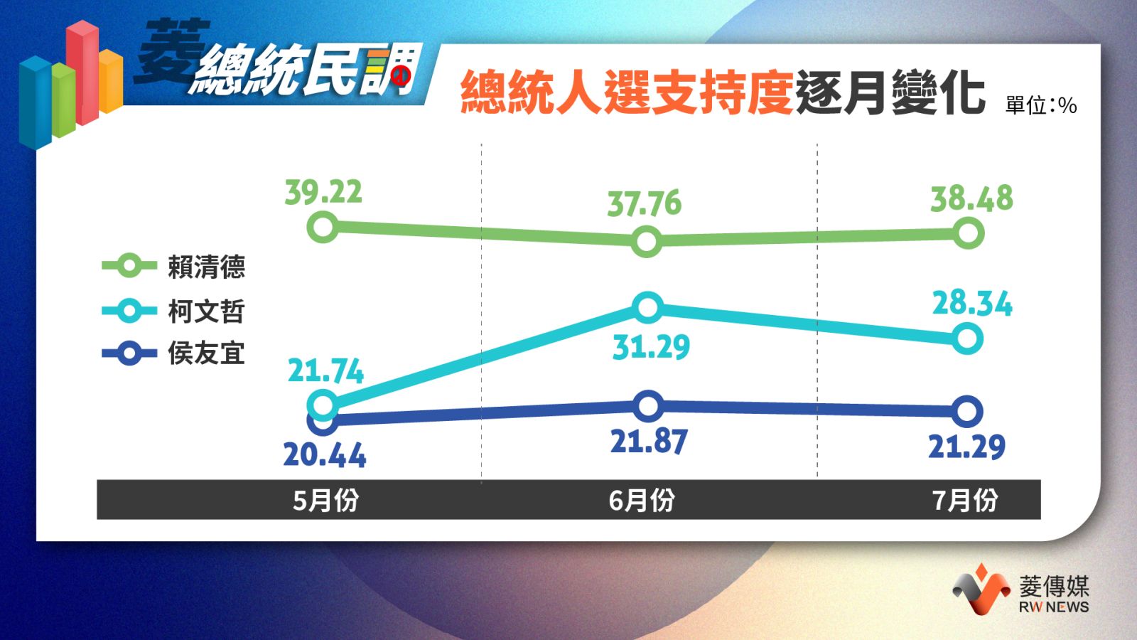 據《菱傳媒》委託皮爾森數據負責執行的7月份總統支持度網路民調,在侯友宜、民進黨參選人賴清德、民眾黨參選人柯文哲的三腳督選戰中,賴獲38.48%、柯獲28.34%、侯獲21.29%支持度;若是加入鴻海集團創辦人郭台銘,四腳督選戰,賴、柯、侯、郭分別獲38.23%、25.29%、20.39%、9.22%支持度。