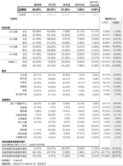 樣本代表性與加權則採用比率估計法,母群體參數依內政部公布2023年6月民眾年齡、性別、戶籍資料,結合皮爾森數據DMP修正網路人口特徵值,逐項重複進行連續性修正,以使樣本特徵與母群體結構達到一致。