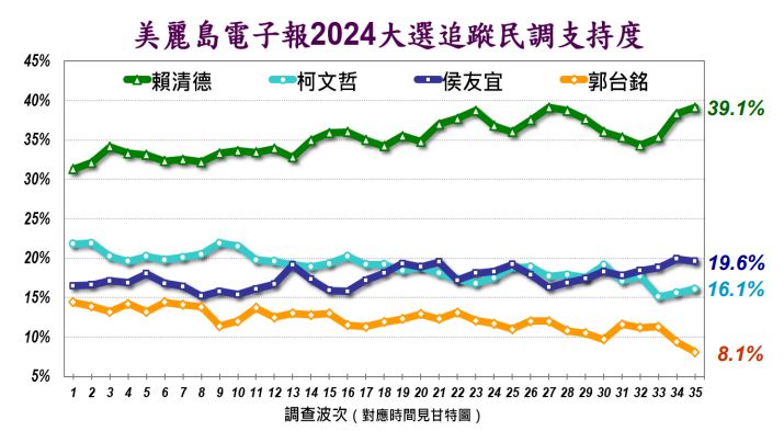 (菱傳媒/綜合報導)媒體人吳子嘉昨(9日)搶光公布《美麗島電子報》第35波最新民調結果,在三腳督的情況下,民進黨賴清德39.7%、國民黨侯友宜20.2%、民眾黨柯文哲18.3%。而在四腳督戰局,賴清德39.1%、侯友宜19.6%、柯文哲16.1%、郭台銘則以8.1%慘墊底。