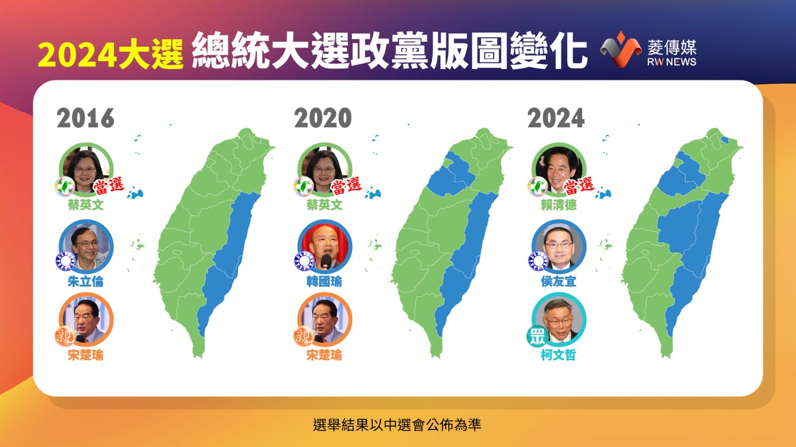 2020年蔡賴配票數創紀錄,民進黨也在16個縣市取得勝利。2024年賴蕭配在14個縣市獲勝,包括台北、新北、桃園、台中、台南、高雄六都外,宜蘭縣、新竹市、嘉義縣、嘉義巿、雲林縣、彰化縣、屏東縣、澎湖縣。尤其在濁水溪以南,得票率與藍白差距更加明顯,其中賴蕭配在台南大勝,得票率超過5成(50.95%),是民進黨得票率最高的縣市,得票數最高的縣市則是新北市的94萬8818票。
