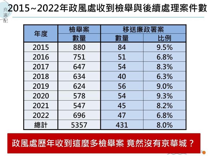 台北市議員簡舒培向台北市政風處調出柯文哲任內共5357件政治檢舉案後,今日在臉書發文表示,京華城案今年5月分案偵辦,除了柯文哲、彭振聲、沈慶京等被告外,檢廉也約談了許多市府的基層公務員,根據媒體報導,至今已約談超過60人。但檢舉案中,只有431案移送廉政署,比例僅8%。簡說,她向政風處長質詢時,竟然裡面沒有一件跟京華城有關。