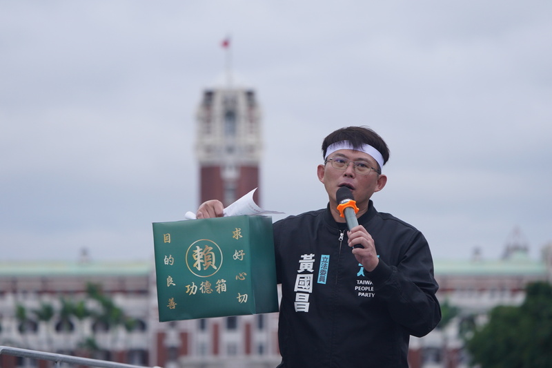 民眾黨立法院黨團總召黃國昌致詞指出,8年前,前總統蔡英文選總統時告訴全國的勞工,勞工是她心中最軟的那一塊,且承諾工資要增加、工時要減少,但勞工迎來的是修惡的《勞基法》、砍掉7天假,還有一位要全國勞工一起做功德的前行政院長賴清德、現在當選的總統。