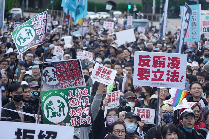 民眾黨「反霸凌,護勞權」大遊行今下午1點30分在勞動部前集結,民眾黨公職及與會團體身穿黑衣、繫上白絲帶出席,並提出「反霸凌立專法、支持警消設立工會、吹哨者保護法立法」3項訴求。主辦單位表示,現場超過3000人參與。