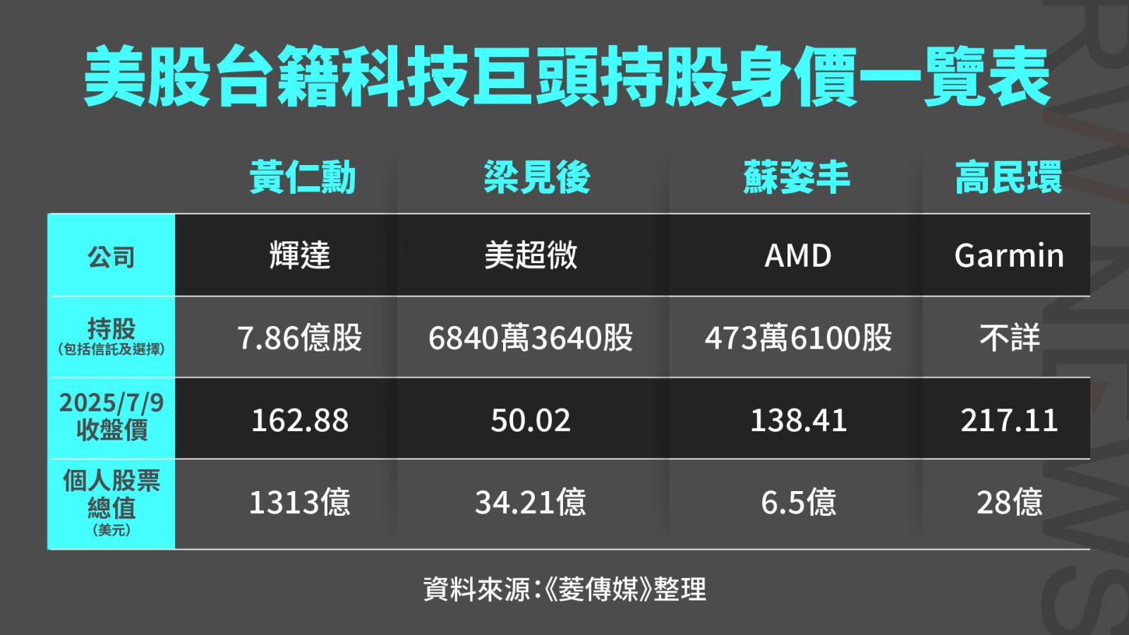除了黃仁勳之外,台灣囝仔隨著這波美股回到歷史高點,個人持股的身價也水漲船高,跟著黃仁勳打拚的美超微創辦人梁見後,個人身價回到34億美元(2025年2月申報賣股資料),雖然比不上高峰的60億美元,但是比起之前因被踼爆財務造假風波後的低點,身價也回來了50%。和黃仁勳有親戚關係,也都是同樣出自台南的AMD(超微)CEO蘇姿丰則是因持股數不高,但也有6.5億美元的市值(2025年3月公司財報),依舊是一般人難以企及的高度。