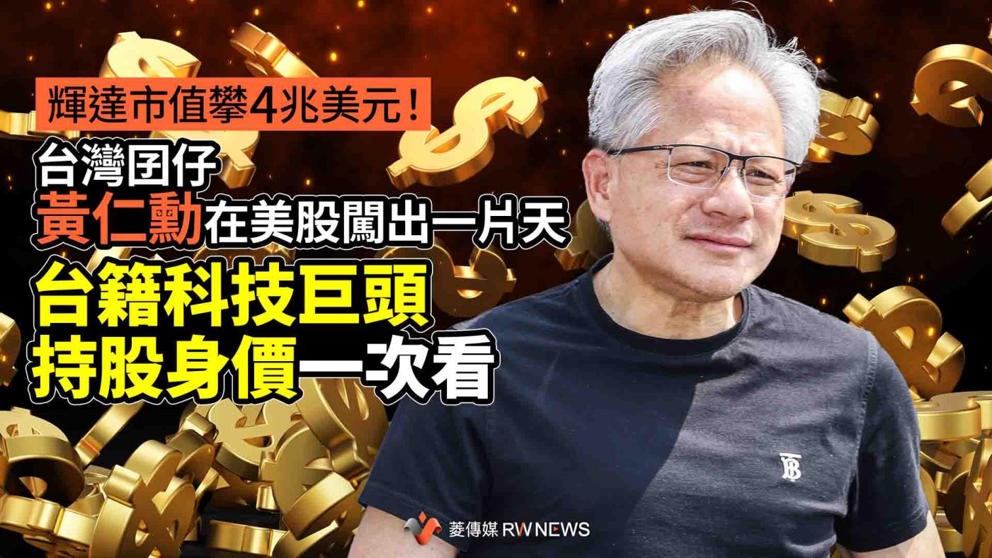 (菱傳媒/台北報導)今(美東9日)收盤的美股主要指數全面上揚,其中,輝達Nvidia(NVDA-US)股價勁揚1.8%,收盤價為162.88,再創歷史新高,輝達盤中市值首度攀上4兆美元,成為全球首家突破此門檻的企業,公司創辦人黃仁勳的持股價值也突破1300億美元,換算成台幣他也成為4兆男。