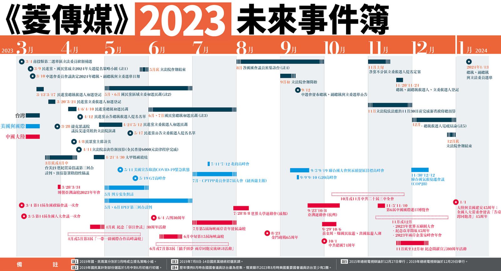 除了政治,2023年的重點議題還有通膨、食物短缺、能源,是重要國際會議討論的議題,但光看未來事件表無法預測嚴重性,《菱傳媒》2024大選未來事件簿可以讓政治與產業佈局者看清前進的方向,辨識前方的地形地物,但不是推背圖。如何更進一步掌握趨勢,《菱傳媒》將持續透過報導、專欄評論、出版品與活動各界的策略思考者互動。