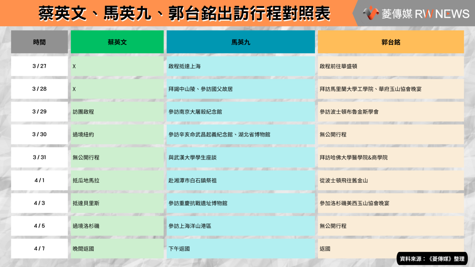 (菱傳媒/綜合報導)2024總統大選在即,藍綠政治領袖紛紛選在近日出訪,較勁意味濃厚。前總統馬英九昨(27日)啟程赴中展開祭祖及交流行程,是否會與中共高層會晤受各界關注;爭取國民黨總統大選提名的鴻海創辦人郭台銘昨晚也啟程赴美展開,除拜會華府重要人士外,也將拜訪美國智庫、赴哈佛大學演講;總統蔡英文預計在明(29日)率團拜訪中美洲友邦並過境美國,與美國眾議院議長麥卡錫會面也備受矚目;《菱傳媒》整理了3人出訪行程對照表,供讀者瞭解3人拚外交重點。